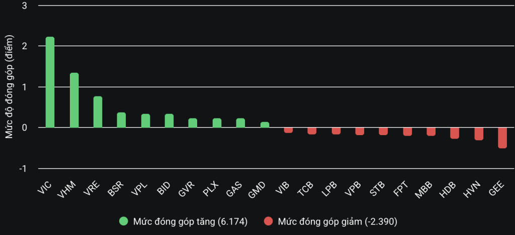 Dù có thời điểm lùi về sát mốc tham chiếu do áp lực bán gia tăng nhưng sự trợ lại tích cực của 4 cổ phiếu nhà Vingroup gồm VIC, VHM,VRE và VPL đã giúp VN-Index khởi sắc trở lại.